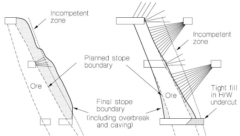 Aplicação das cordoalhas como cablebolts no reforço dos realces. Adaptado de Hutchinson & Diederichs (1996).