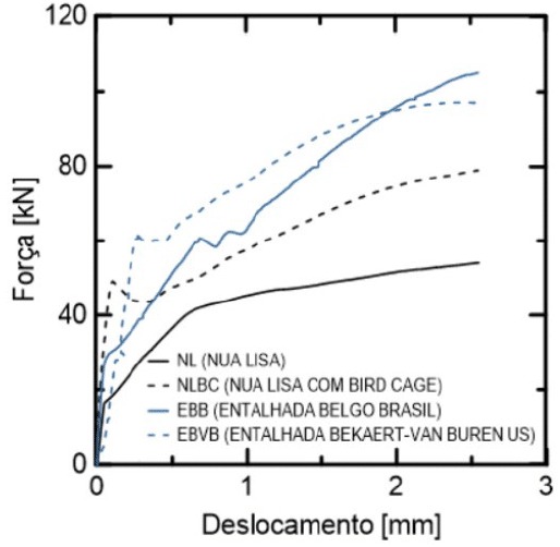 Resultados de ensaios comparativos entre as cordoalhas entalhadas, lisas, birdcage e garford (standard cable). Adaptado de Belgo Arames (primeira imagems) e Tadolini & Dolinar (2017).